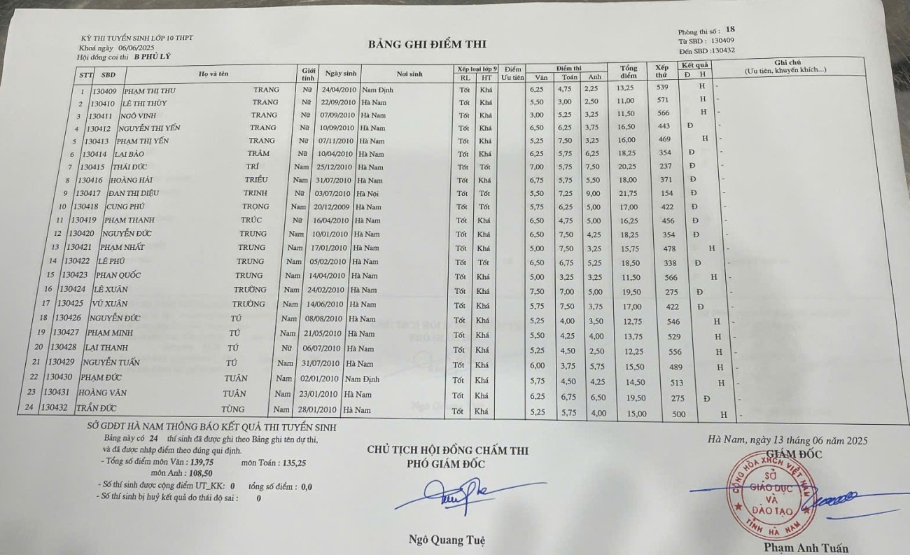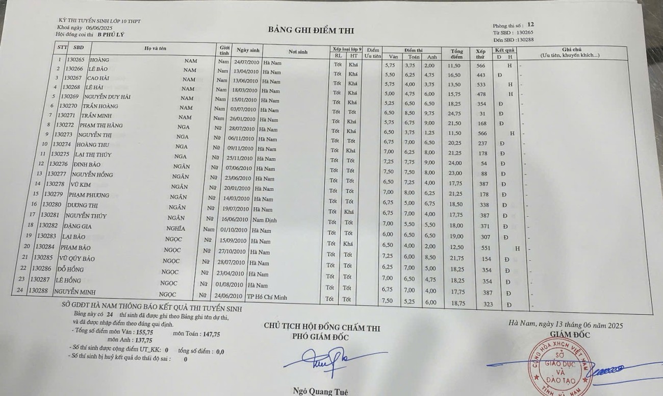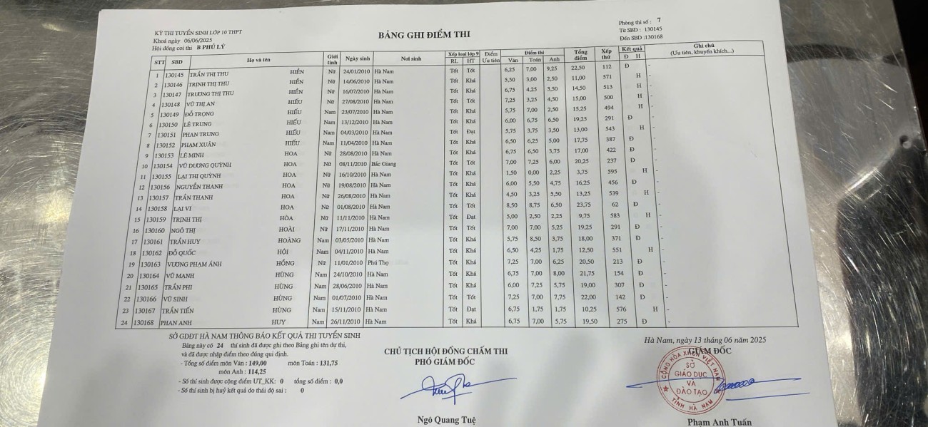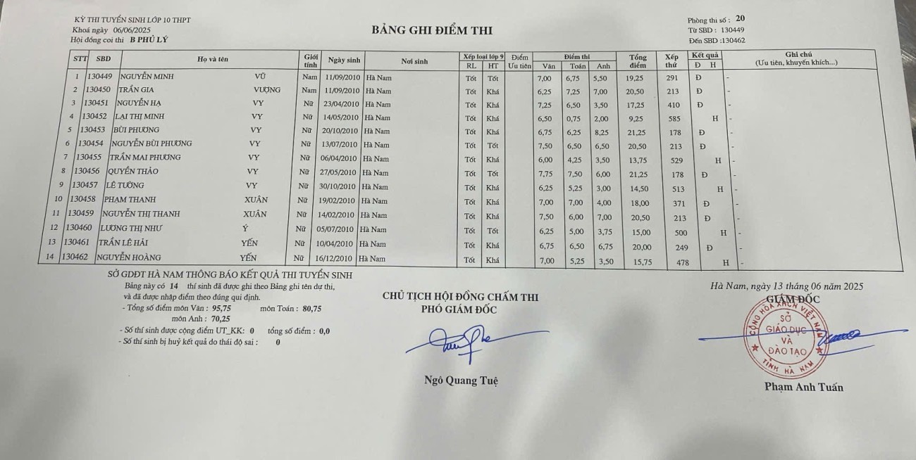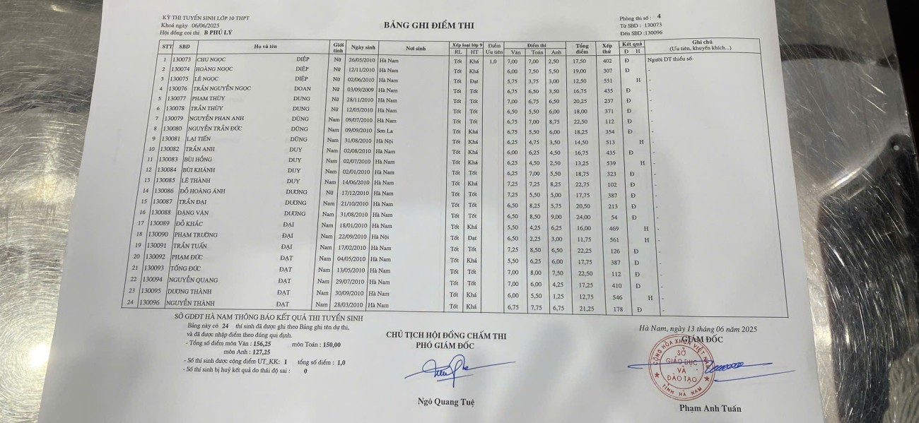 Căn cứ vào kết quả kỳ thi tuyển sinh vào lớp 10 THPT năm học 2025–2026 do Sở Giáo dục và Đào tạo Hà Nam tổ chức, điểm chuẩn trúng tuyển nguyện vọng 1 vào Trường THPT B Phủ Lý là 28,75 điểm.