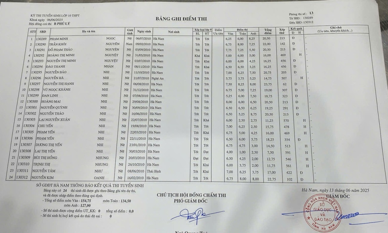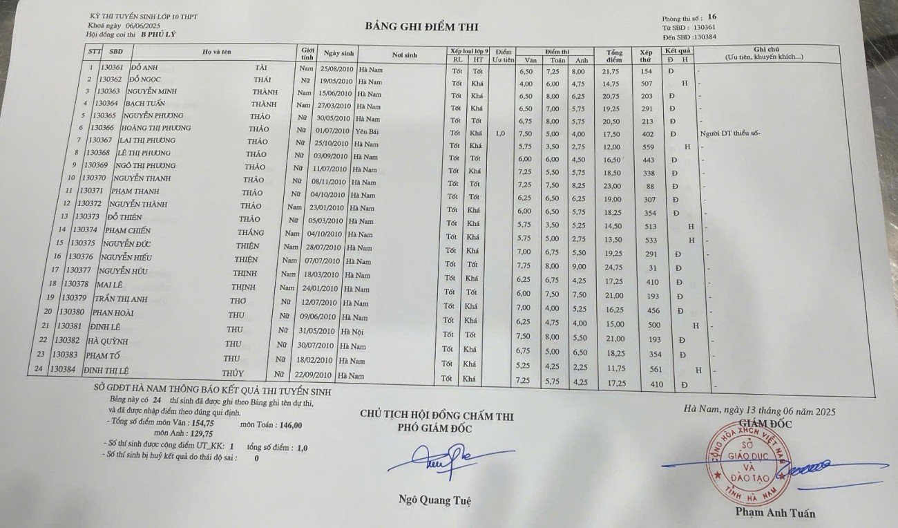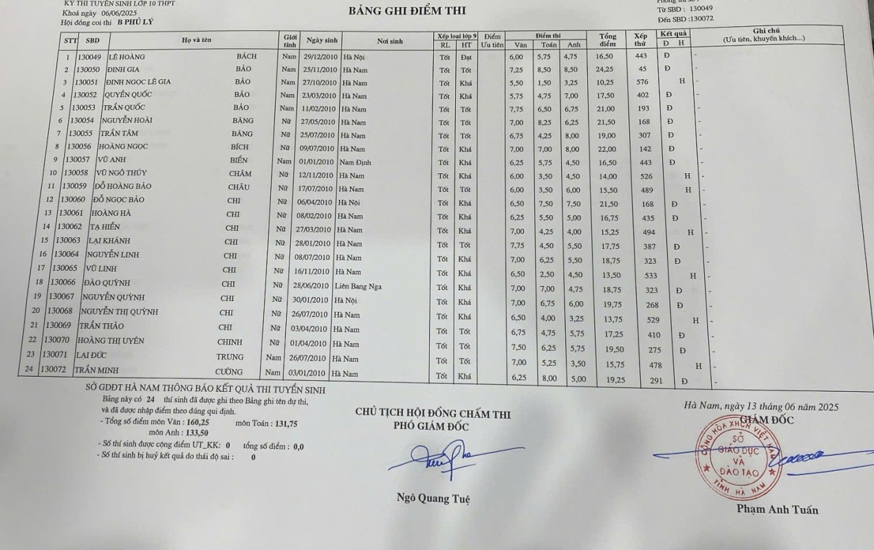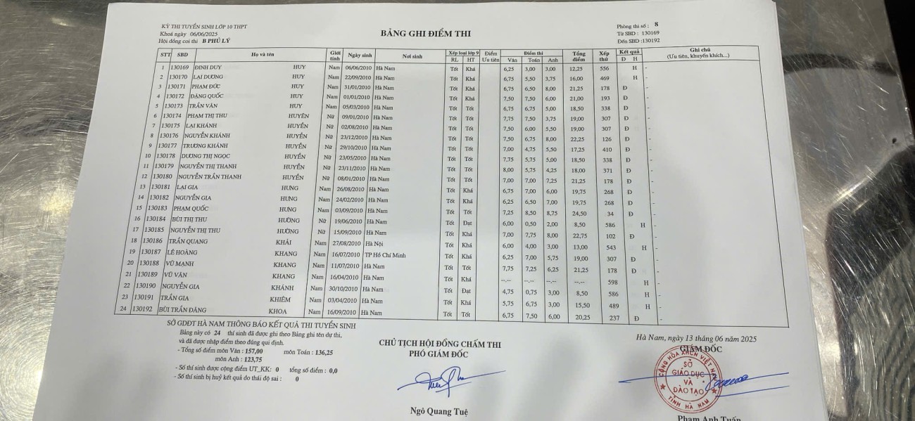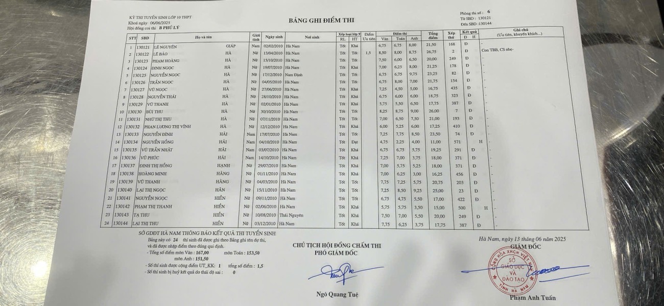 Căn cứ vào kết quả kỳ thi tuyển sinh vào lớp 10 THPT năm học 2025–2026 do Sở Giáo dục và Đào tạo Hà Nam tổ chức, điểm chuẩn trúng tuyển nguyện vọng 1 vào Trường THPT B Phủ Lý là 28,75 điểm.