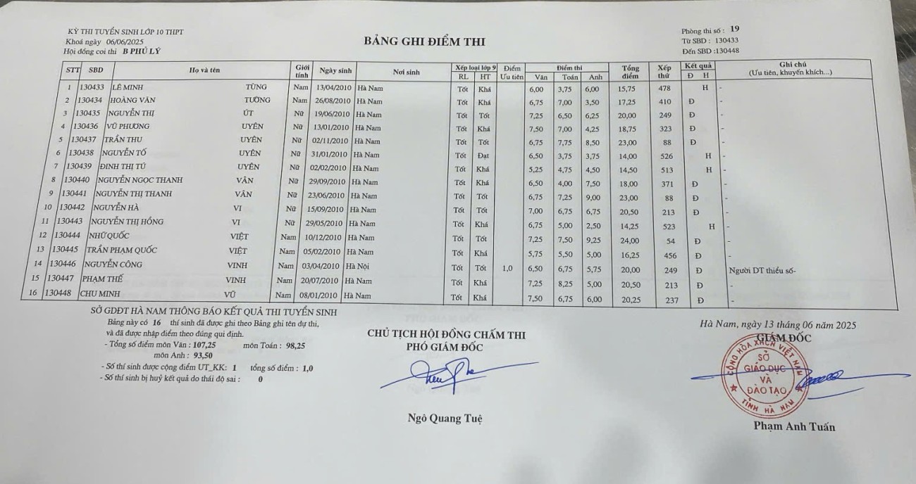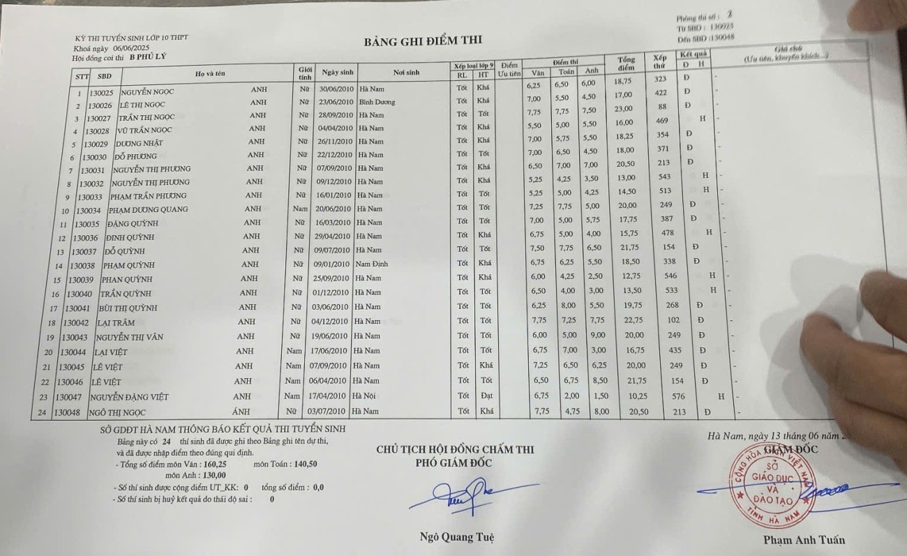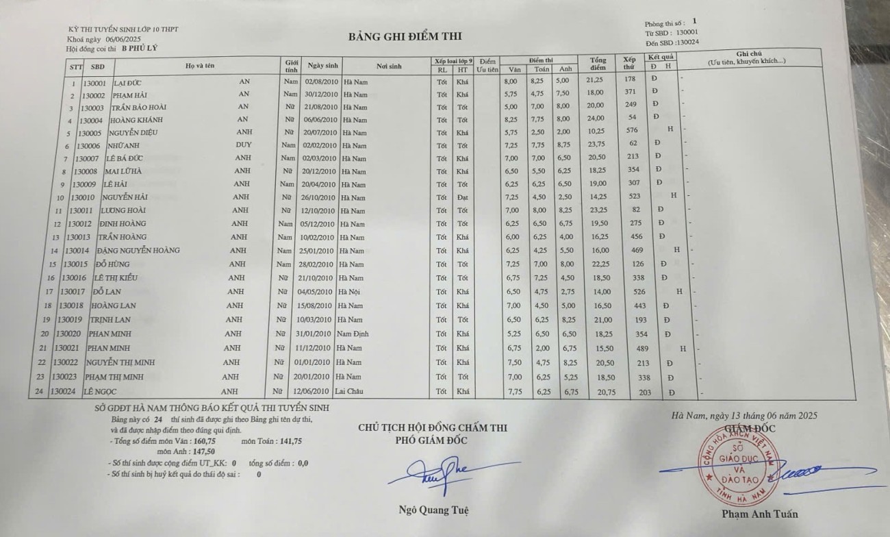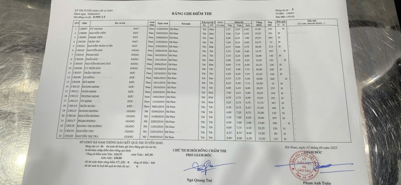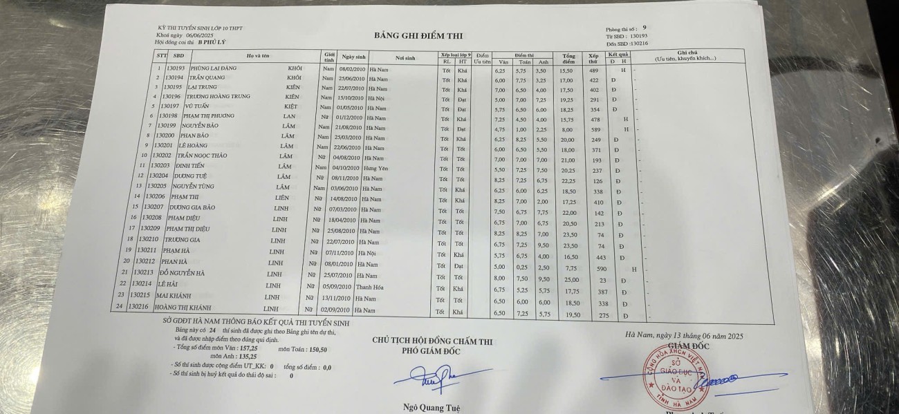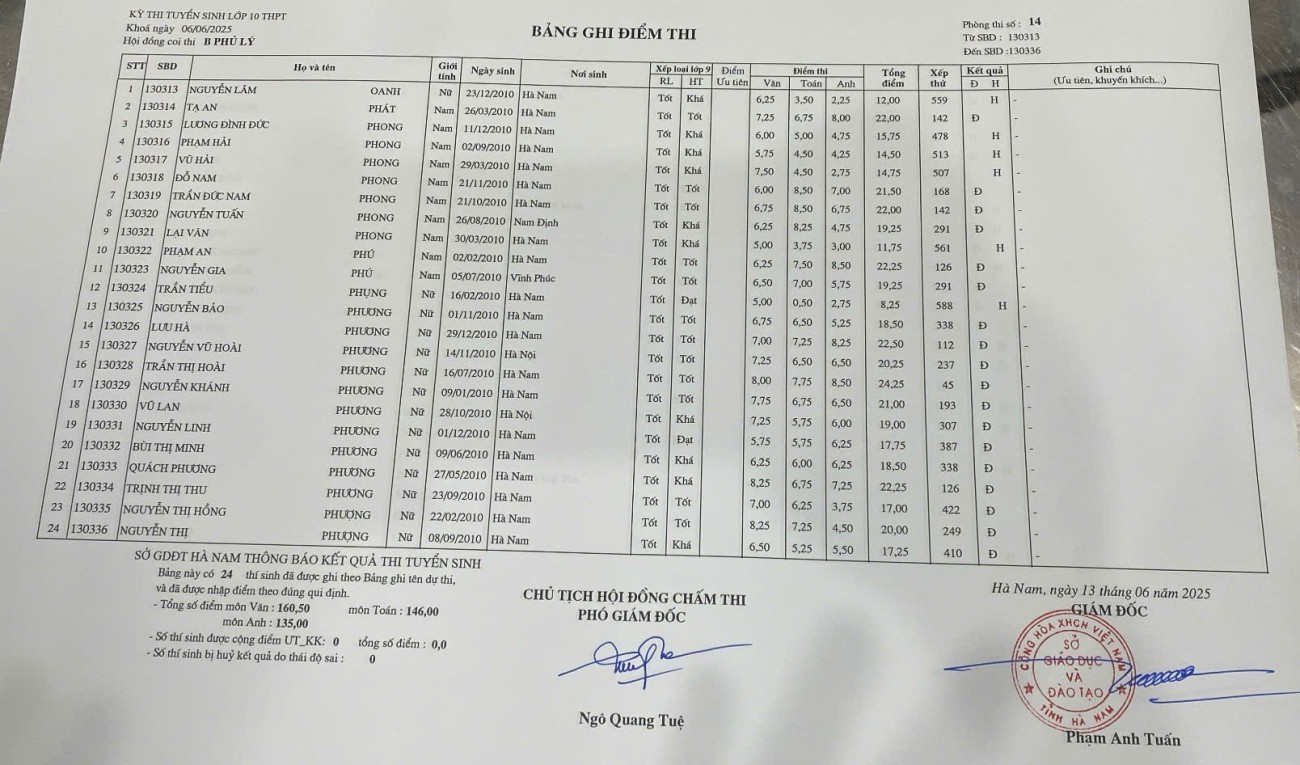Căn cứ vào kết quả kỳ thi tuyển sinh vào lớp 10 THPT năm học 2025–2026 do Sở Giáo dục và Đào tạo Hà Nam tổ chức, điểm chuẩn trúng tuyển nguyện vọng 1 vào Trường THPT B Phủ Lý là 28,75 điểm.