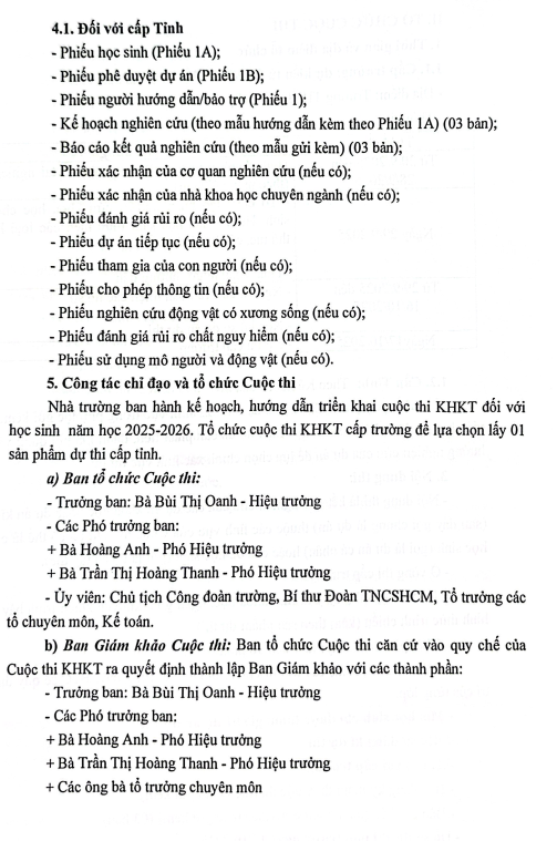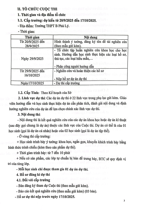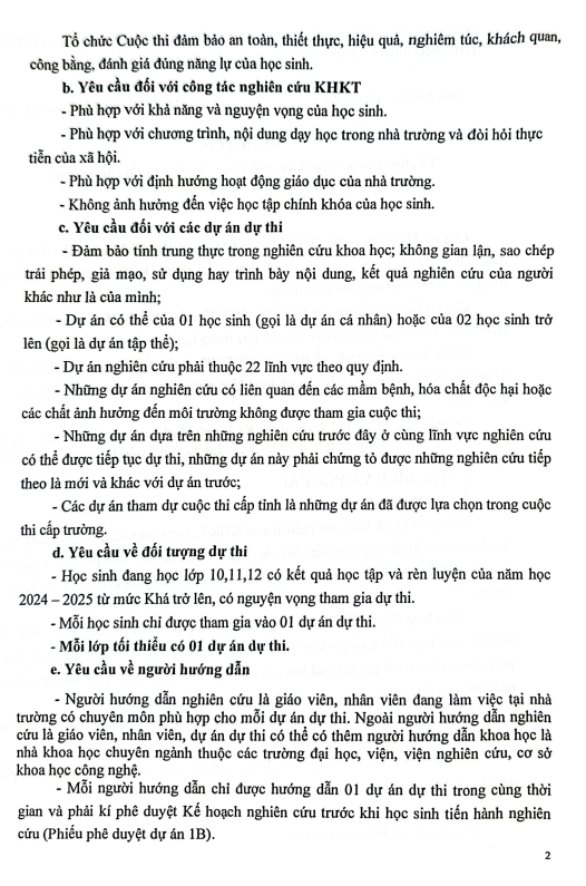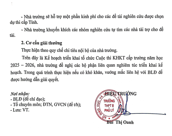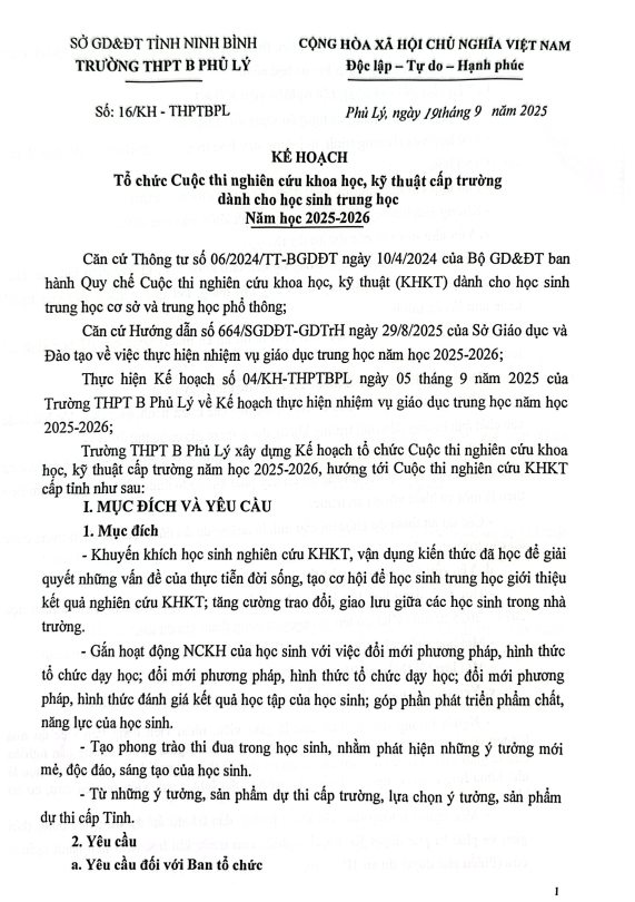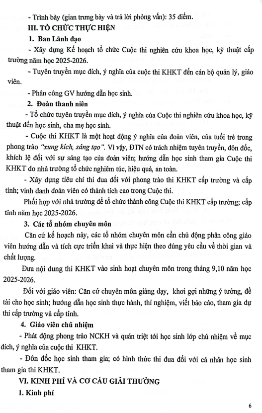 Kế hoạch tổ chức ngiên cứu cuộc thi KHKT cấp trường dành cho học sinh trung học 2025